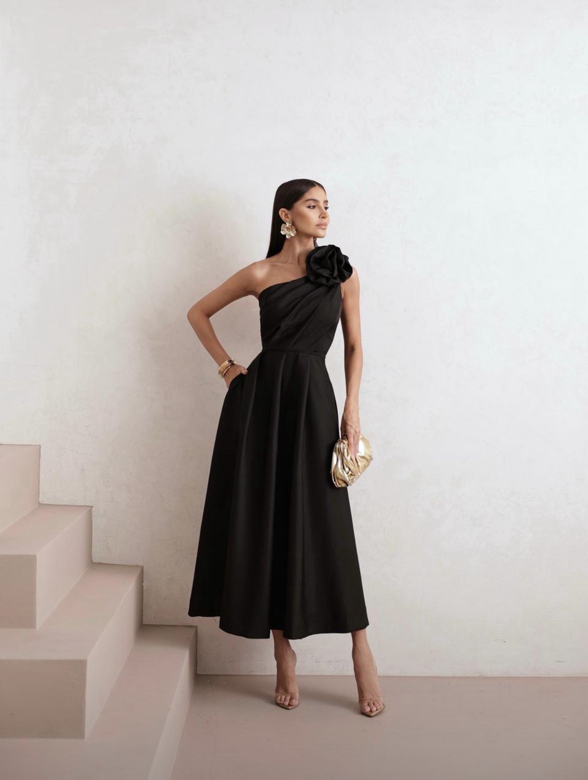 O destaque fica por conta da maxi flor aplicada no ombro, um detalhe imponente e super feminino que transforma o vestido em uma peça única. Com modelagem um ombro só (nula manga) e comprimento midi, esse vestido equilibra elegância e presença com charme absoluto.