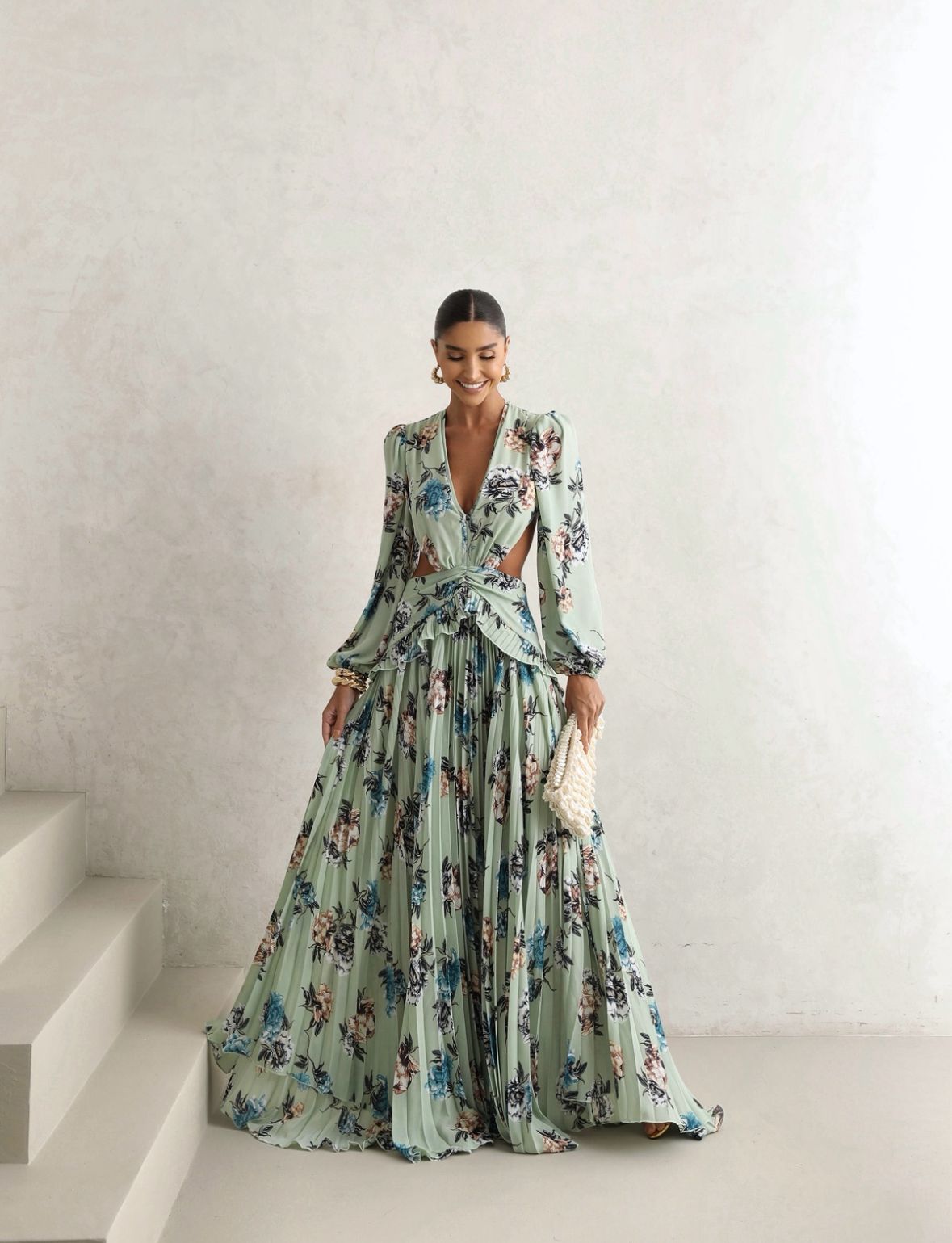 Confeccionado em chiffon leve e fluido, ele encanta com sua estampa floral delicada e movimento natural da saia plissada.