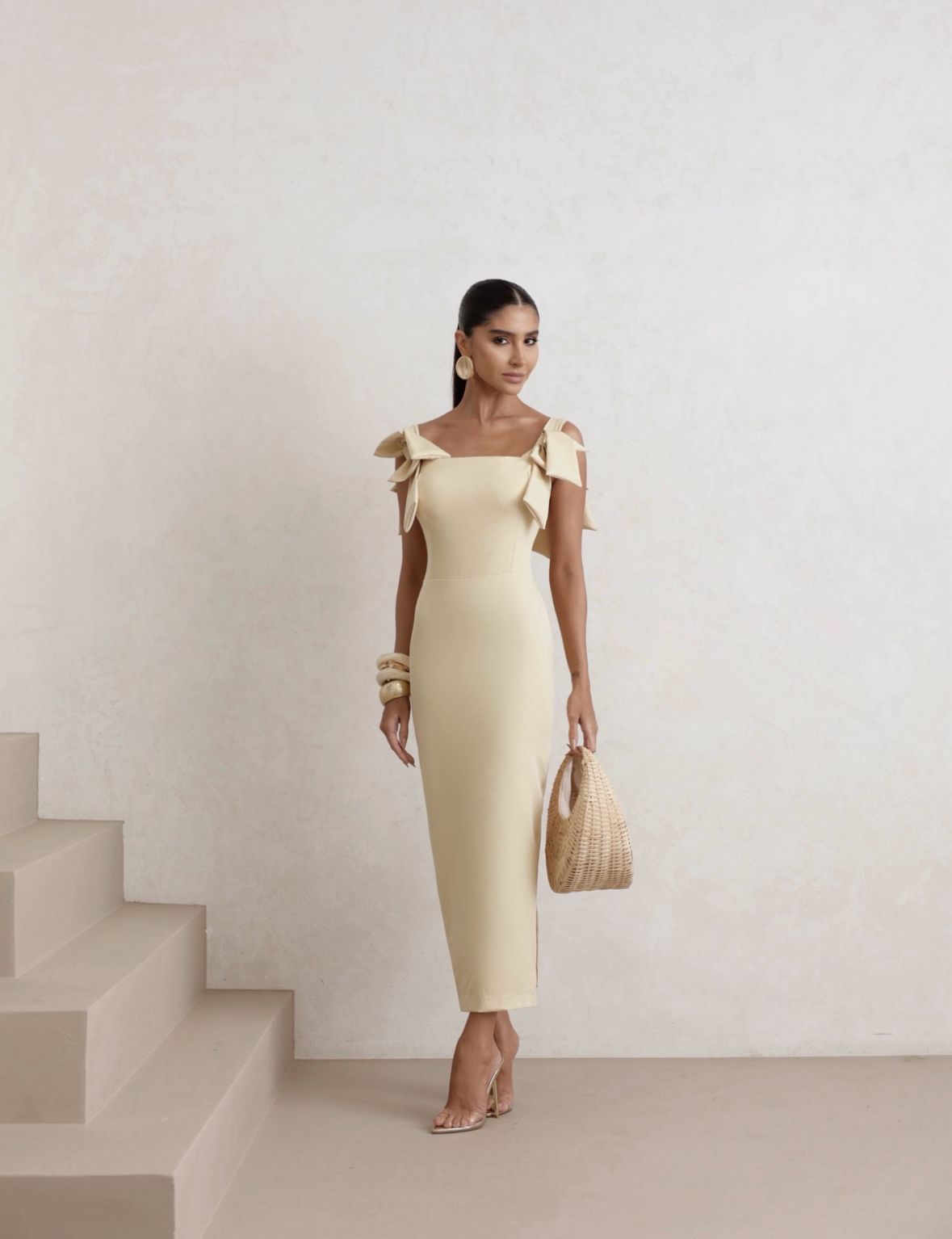 Com dois laços de cada lado para amarração nos ombros, o vestido permite ajustar o caimento de forma personalizada, além de adicionar charme e feminilidade ao visual. Sua modelagem tubinho midi valoriza as curvas com sutileza, criando uma silhueta refinada e alongada.