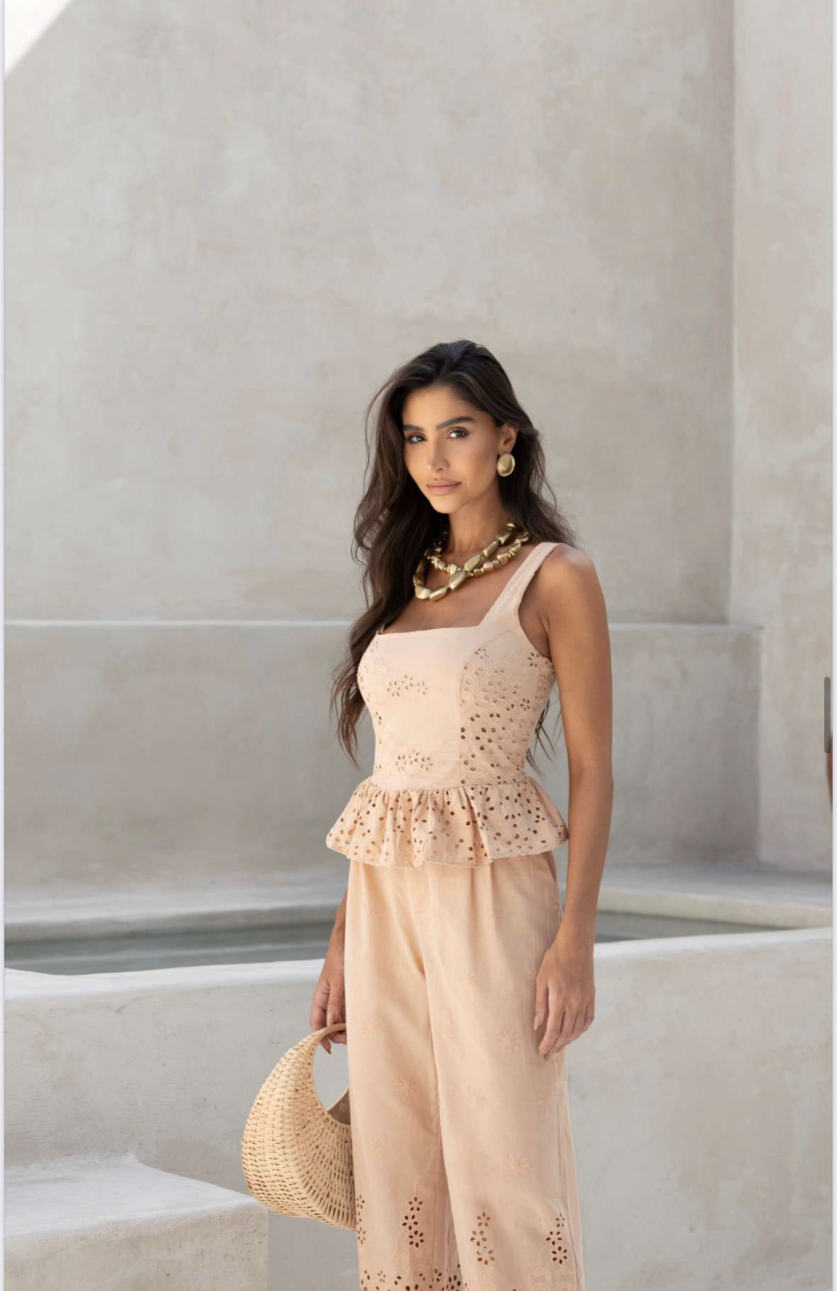 • Caimento - Leve e levemente estruturado. O tecido acompanha o corpo de forma natural, com mais firmeza nas áreas bordadas e recortadas, especialmente na parte do barrado (geralmente a barra inferior).