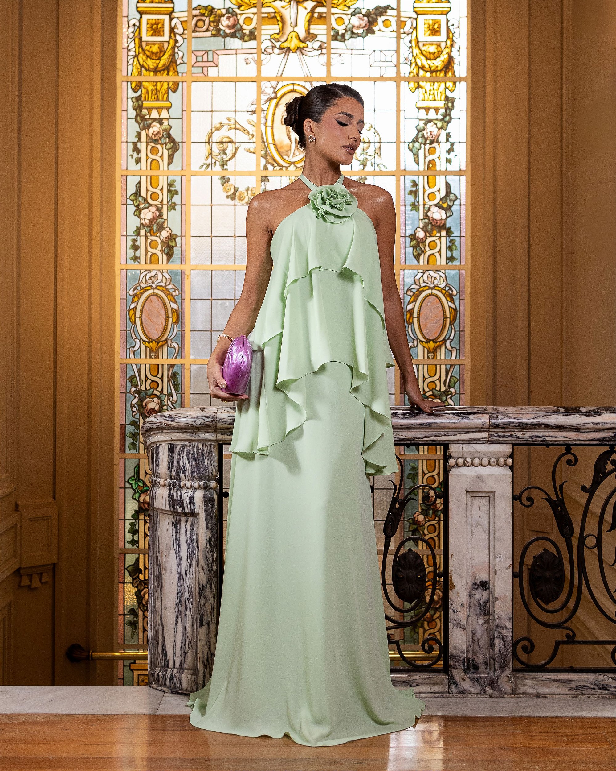 • Saia Longa sem Fenda: A saia flui naturalmente em um corte clássico e contínuo. A ausência de fenda reforça a proposta de um look mais romântico e tradicional.