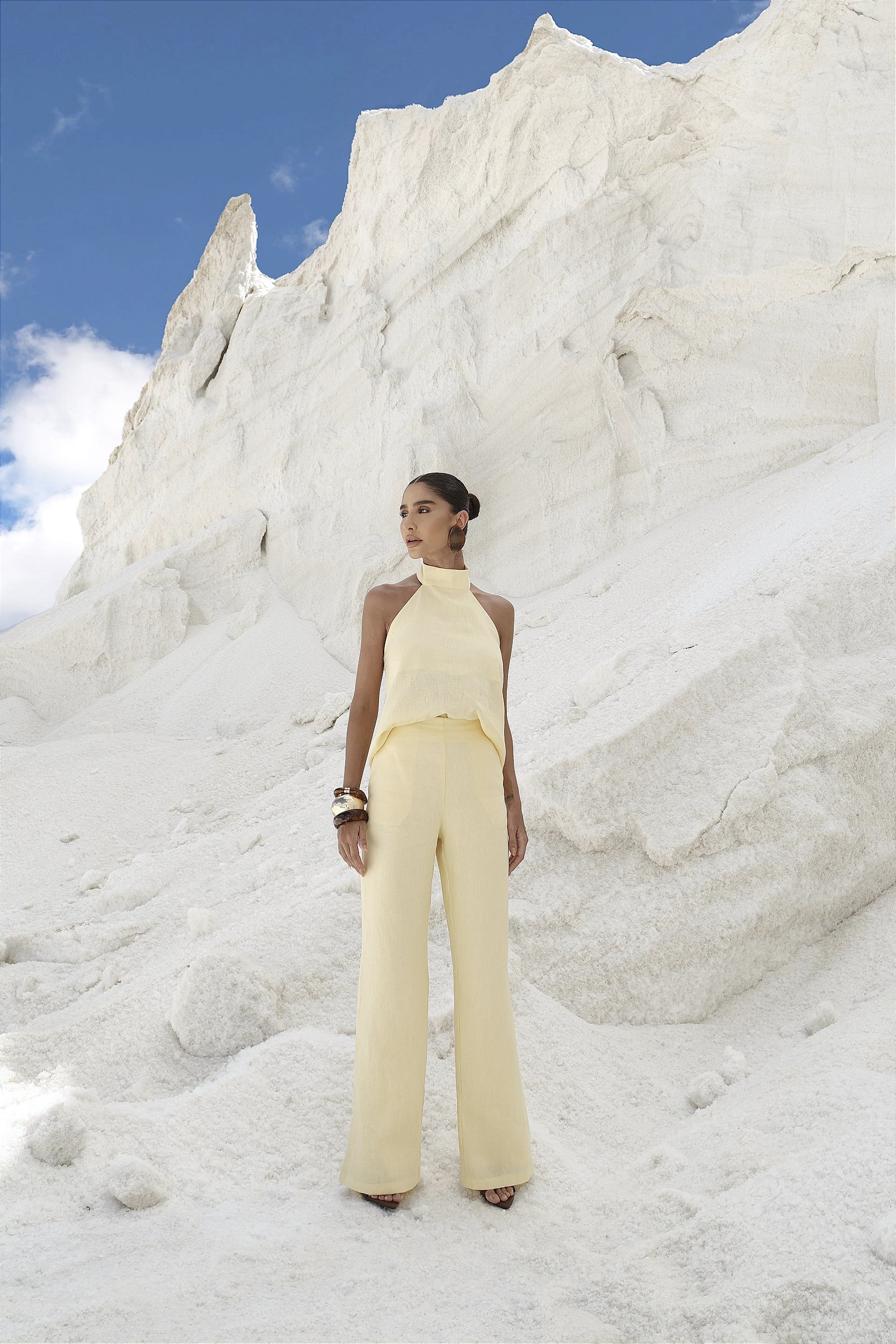 A blusa frente única com gola alta estilo halter valoriza o pescoço e os ombros, proporcionando um visual moderno e feminino. O lastex posterior garante ajuste perfeito e conforto durante todo o uso. Já a calça de alfaiataria reta e cintura alta alonga a silhueta e confere um caimento impecável, ideal para diversas ocasiões — de um almoço elegante a um evento noturno. 🌿