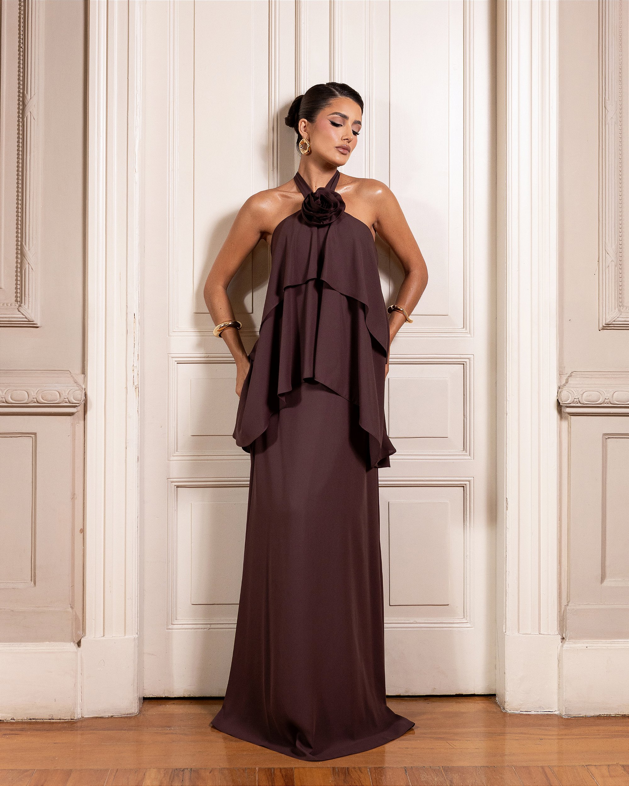 Detalhe Floral e Camadas no Busto: O busto é o grande protagonista, apresentando camadas delicadas que adicionam volume na medida certa, finalizado com um detalhe de flor artesanal que traz um toque de alta costura.