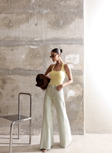 • Caimento - O caimento é estruturado e definido, mantendo a forma da peça. Valoriza cortes retos, mom, wide leg e modelagens clássicas do jeans.