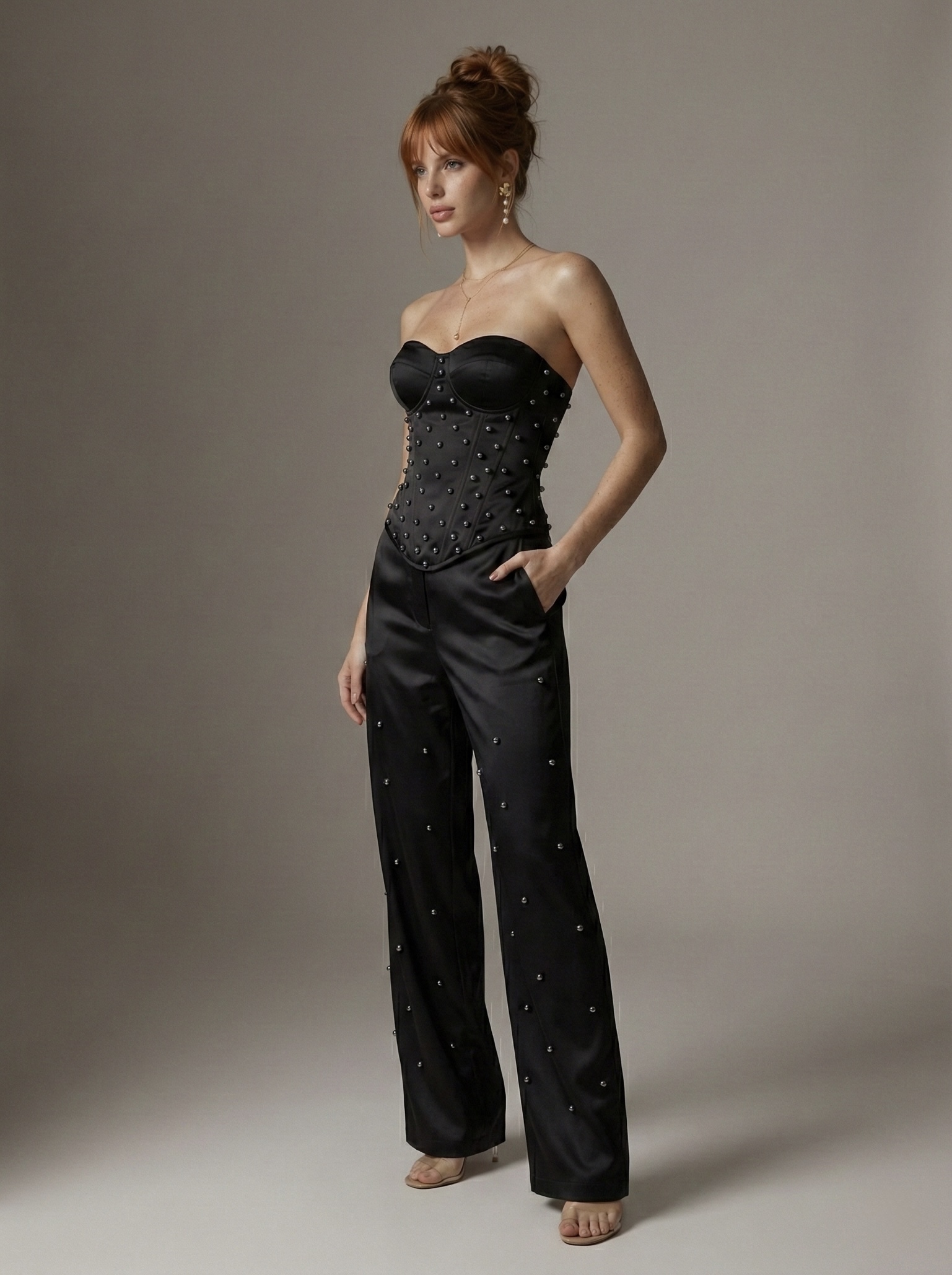 O grande diferencial desta peça é a aplicação artesanal de pérolas na parte frontal, que adiciona textura e pontos de luz delicados ao brilho do cetim. Para garantir o máximo conforto e um caimento impecável, a calça é inteiramente forrada, evitando transparências e marcações, e conta com bolsos faca laterais que reforçam o corte refinado da alfaiataria.