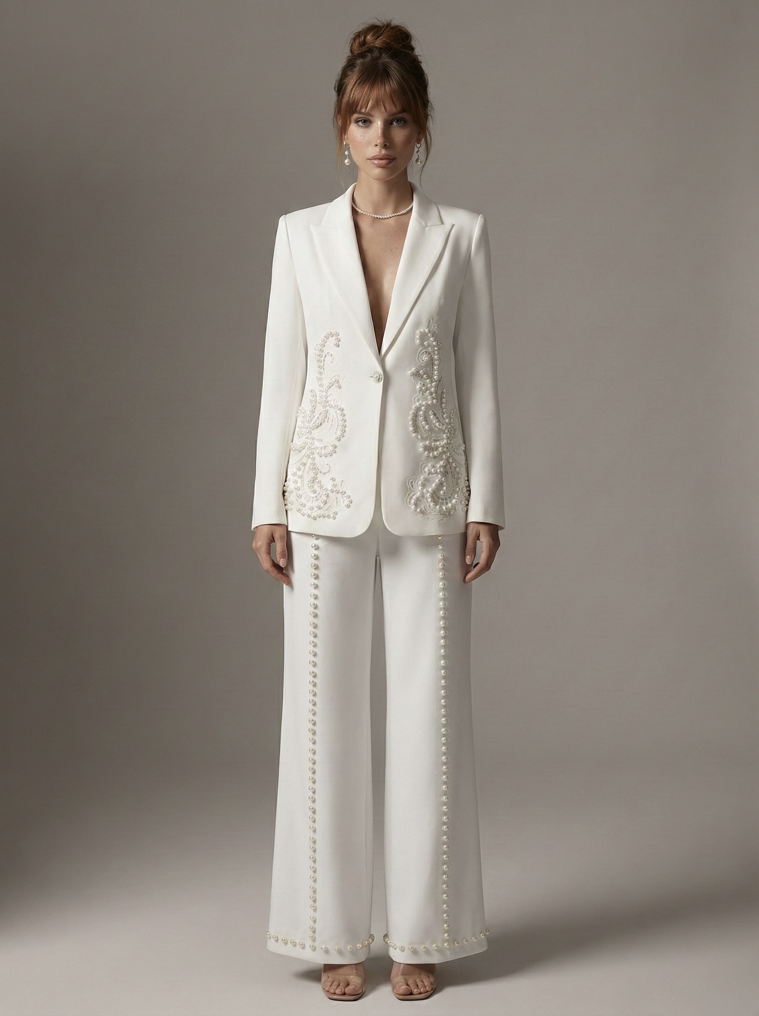 O design é enriquecido com aplicações minuciosas de pérolas na parte frontal e na barra, criando um contraste refinado com a estrutura da peça. O vinco frontal marcado reforça a estética clássica da alfaiataria, enquanto os bolsos laterais modelo faca e os bolsos fakes frontais garantem um acabamento limpo e extremamente chic.