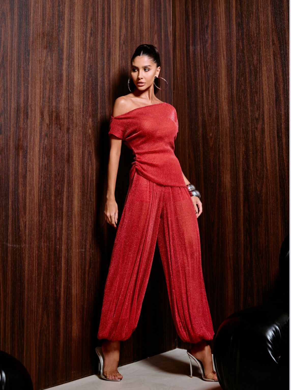 Já a calça modelagem aladin, com cintura alta e elástico nos tornozelos, garante conforto e estilo em um visual fluido e impactante.