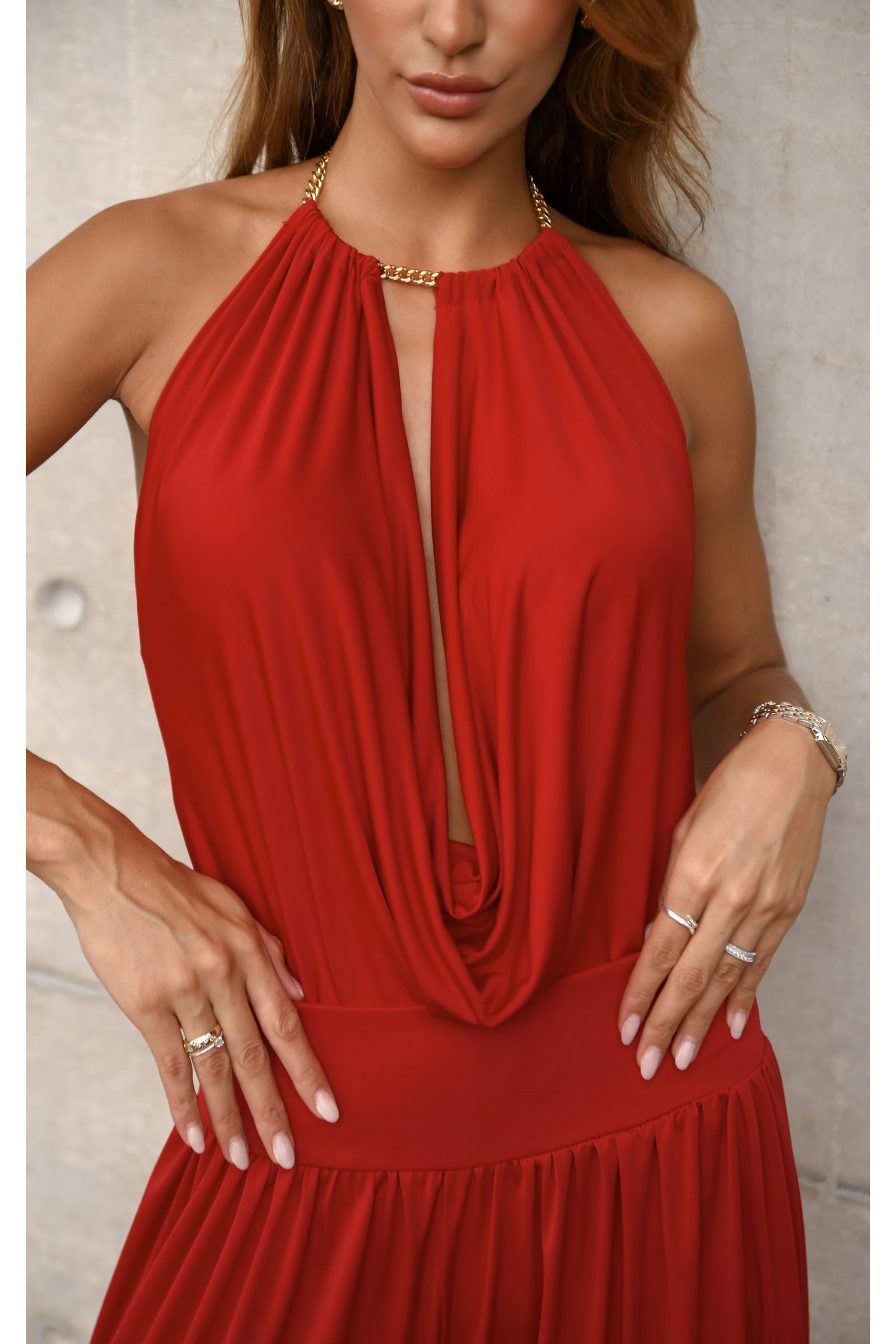 Foco no Colo: O decote halter é o ponto alto do look. Aposte em brincos marcantes e dispense colares para não sobrecarregar o detalhe da argola.