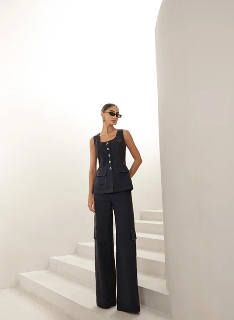Eleve seu guarda-roupa com a sofisticação do nosso Conjunto em Linho Puro. Composto por um colete estruturado e uma calça cargo moderna, este conjunto é a definição do Quiet Luxury: peças que transmitem elegância sem esforço, unindo a nobreza das fibras naturais a um design contemporâneo.