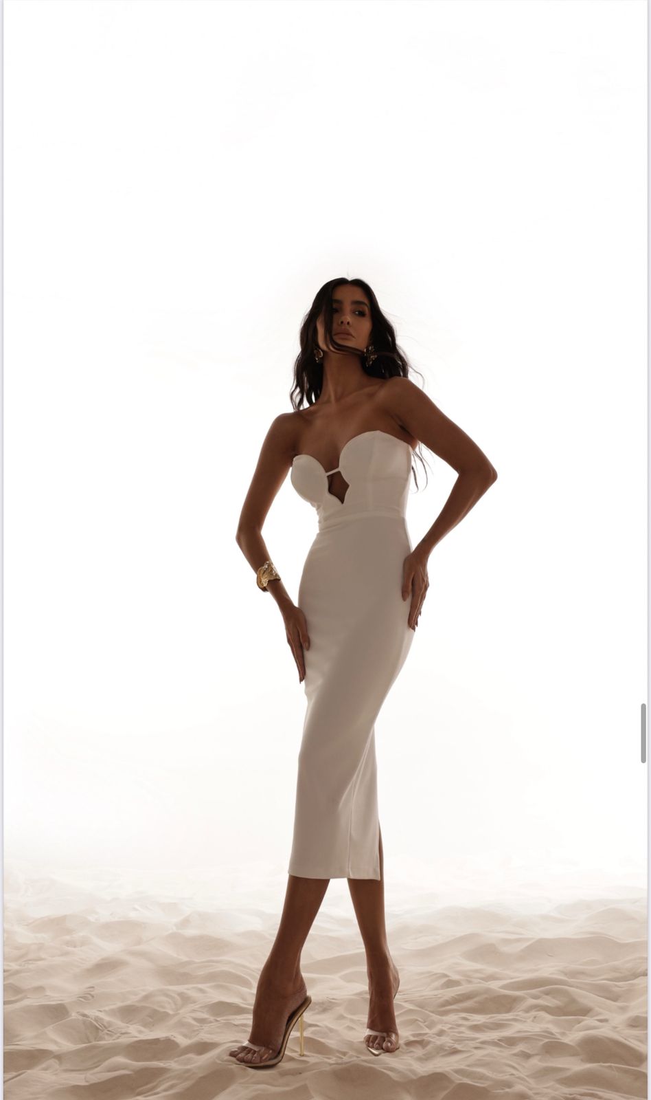 Seu decote coração estruturado com detalhe central valoriza o busto com delicadeza, enquanto a modelagem midi justa realça a silhueta de forma elegante e moderna.