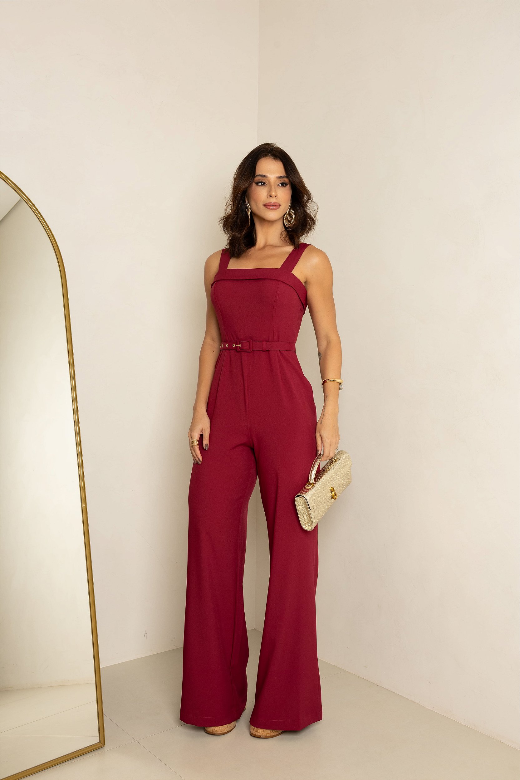 A peça apresenta decote quadrado e alças largas, proporcionando sustentação e conforto. A modelagem peplum na cintura valoriza a silhueta de forma estratégica, enquanto a calça de corte reto oferece fluidez e elegância ao caminhar. O conjunto é finalizado com um cinto exclusivo de fivela dourada, que acentua a região da cintura com um toque de luxo.