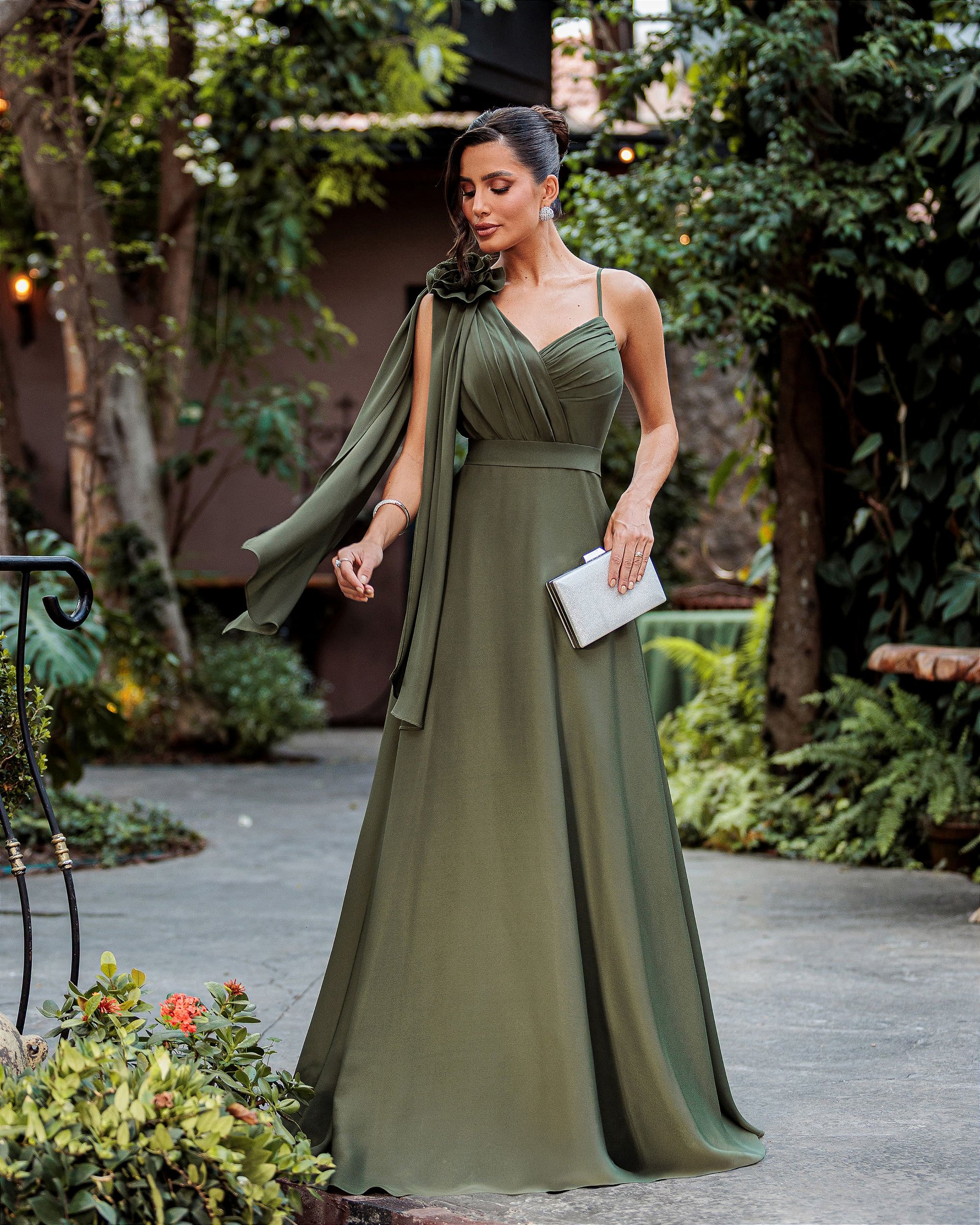 Aposte em acessórios delicados, como brincos de pérola ou pontos de luz, para complementar a suavidade da peça. Um penteado preso ou semi preso realça a flor no ombro e deixa o visual ainda mais harmonioso. Sandálias de salto fino elevam a silhueta e finalizam o look com classe.