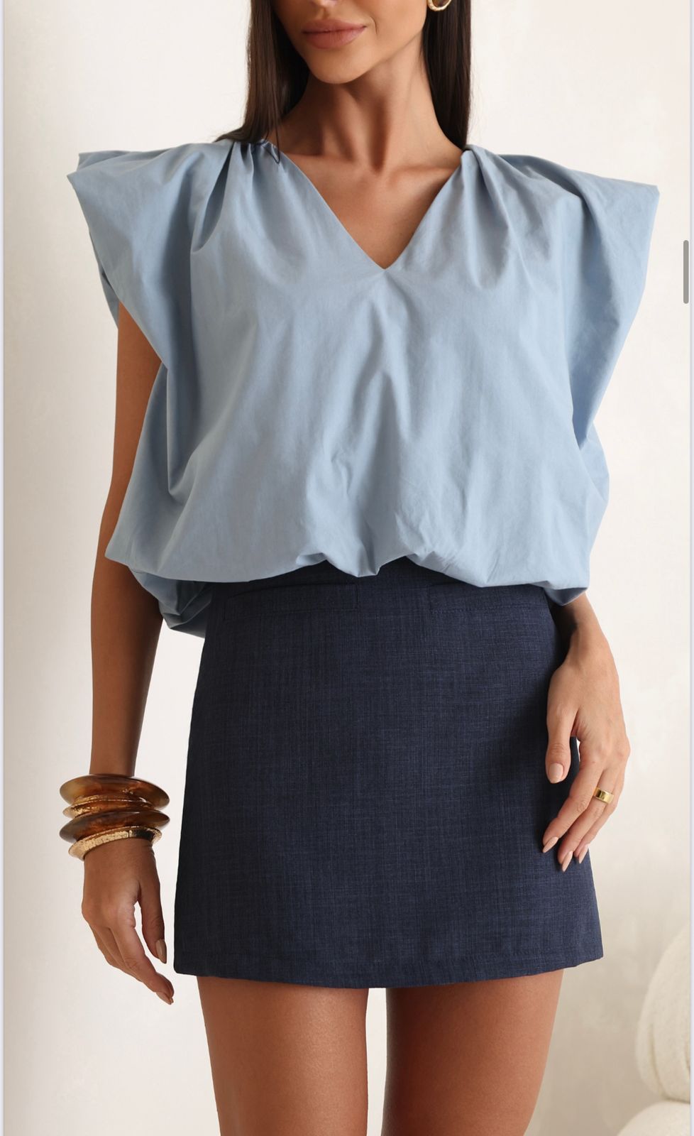 A Blusa Talita é a peça-chave para quem busca um look com personalidade e presença. Com uma modelagem balonê estruturada e decote em V, ela equilibra o volume da barra com a verticalidade do colo, alongando a silhueta enquanto entrega um design moderno e atemporal.