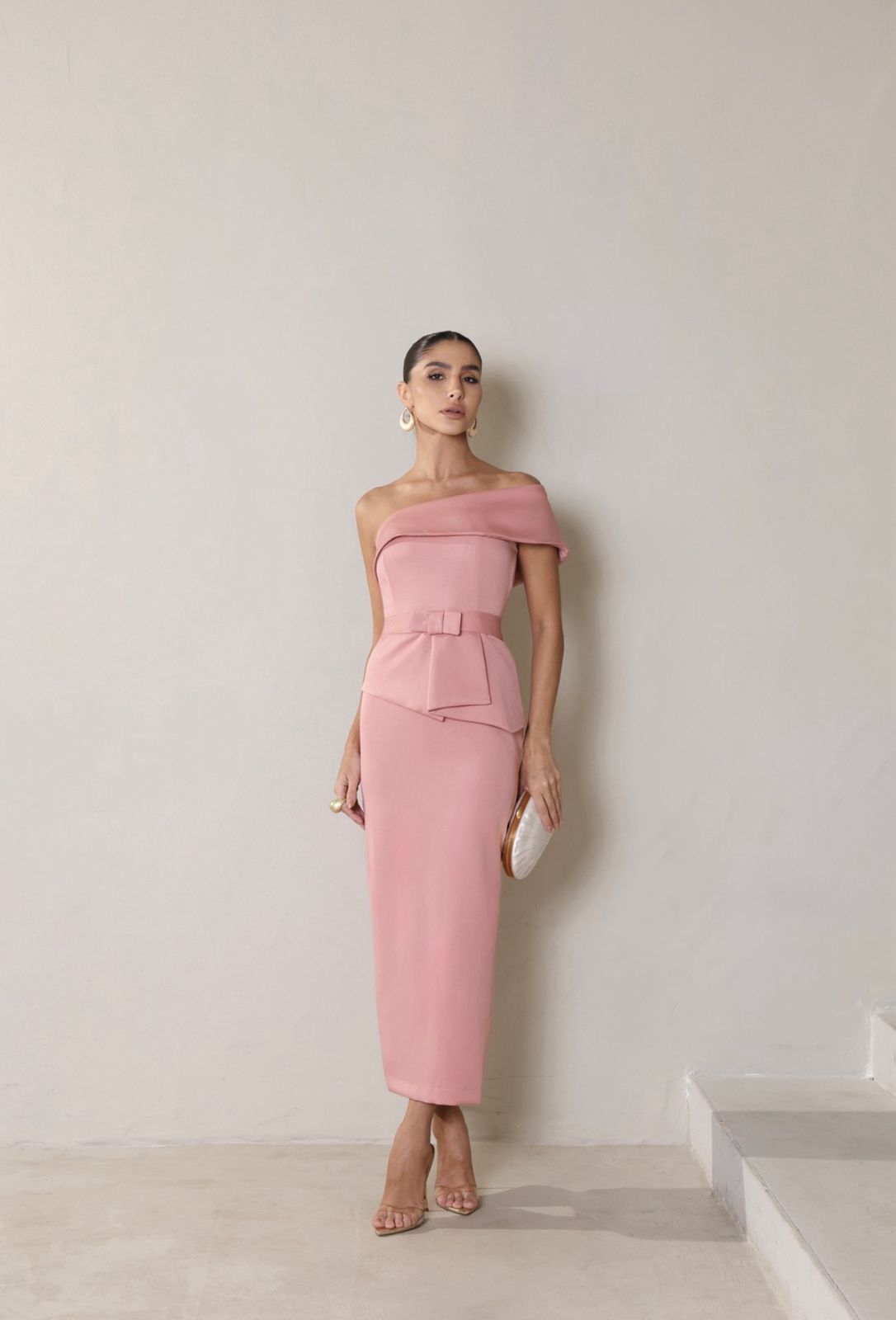 Confeccionado em crepe alfaiataria, o modelo traz um ombro com pala, que destaca o colo com charme e sofisticação. O aro de sustentação garante segurança ao vestir, enquanto a faixa-cinto que acompanha a peça marca a cintura com delicadeza, realçando as curvas com elegância ✨