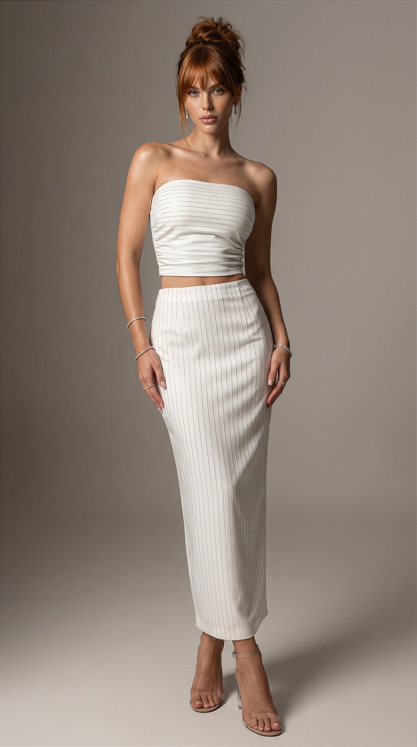 O Conjunto Noblesse é a definição de glamour e sofisticação para noites inesquecíveis. Confeccionado em uma malha premium cravejada de strass, este conjunto foi desenhado para quem deseja brilhar com elegância. O brilho intenso do tecido é equilibrado pelo caimento impecável da saia midi, criando um visual luxuoso e moderno.