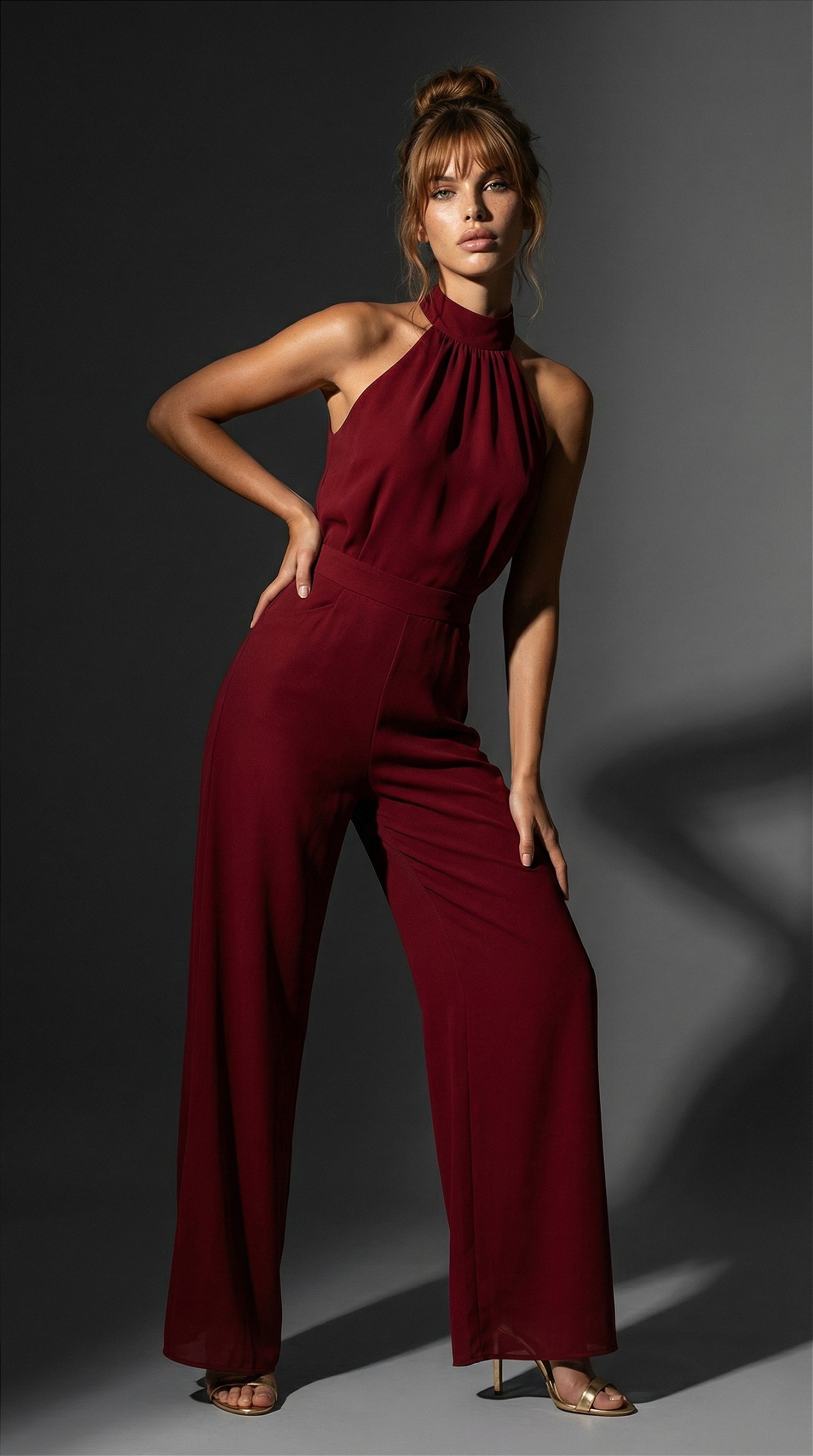 Para um visual de festa à noite, aposte em um penteado preso (coque alto) para evidenciar a gola alta e o decote halter.