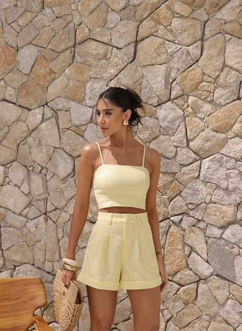 O Shorts Linho Rami com Barra Italiana é a escolha perfeita para quem busca sofisticação e conforto no dia a dia! 💁♀️ Com cintura alta e tecido leve, ele valoriza a silhueta e traz um toque moderno e refinado ao visual. Uma peça curinga que transita entre looks casuais e produções mais arrumadinhas com facilidade! 💼🌿
