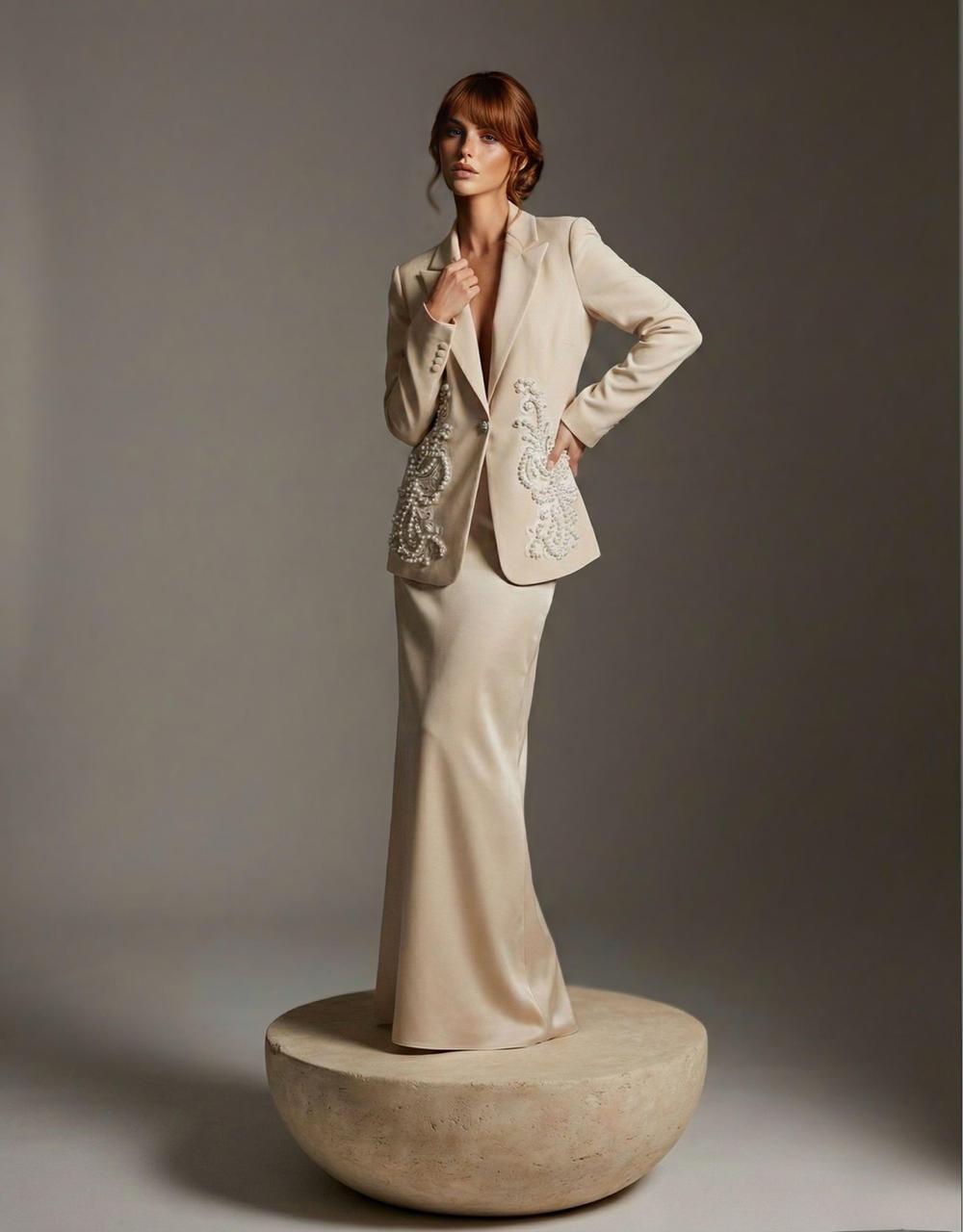 Para eventos noturnos, finalize com salto fino e acessórios minimalistas — o bordado em pérolas já é o protagonista e garante um look elegante e luxuoso.