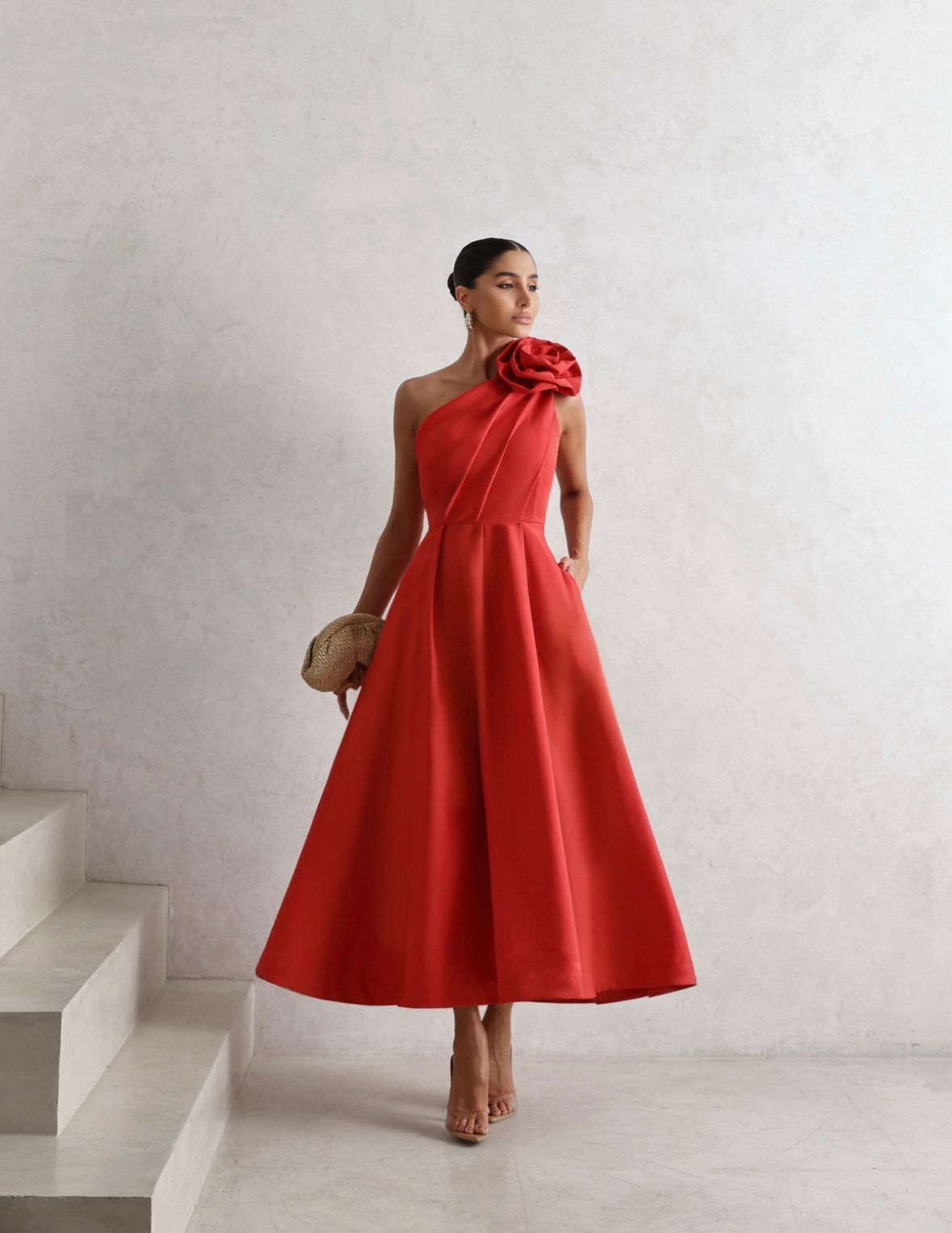 O destaque fica por conta da maxi flor aplicada no ombro, um detalhe imponente e super feminino que transforma o vestido em uma peça única. Com modelagem um ombro só (nula manga) e comprimento midi, esse vestido equilibra elegância e presença com charme absoluto.
