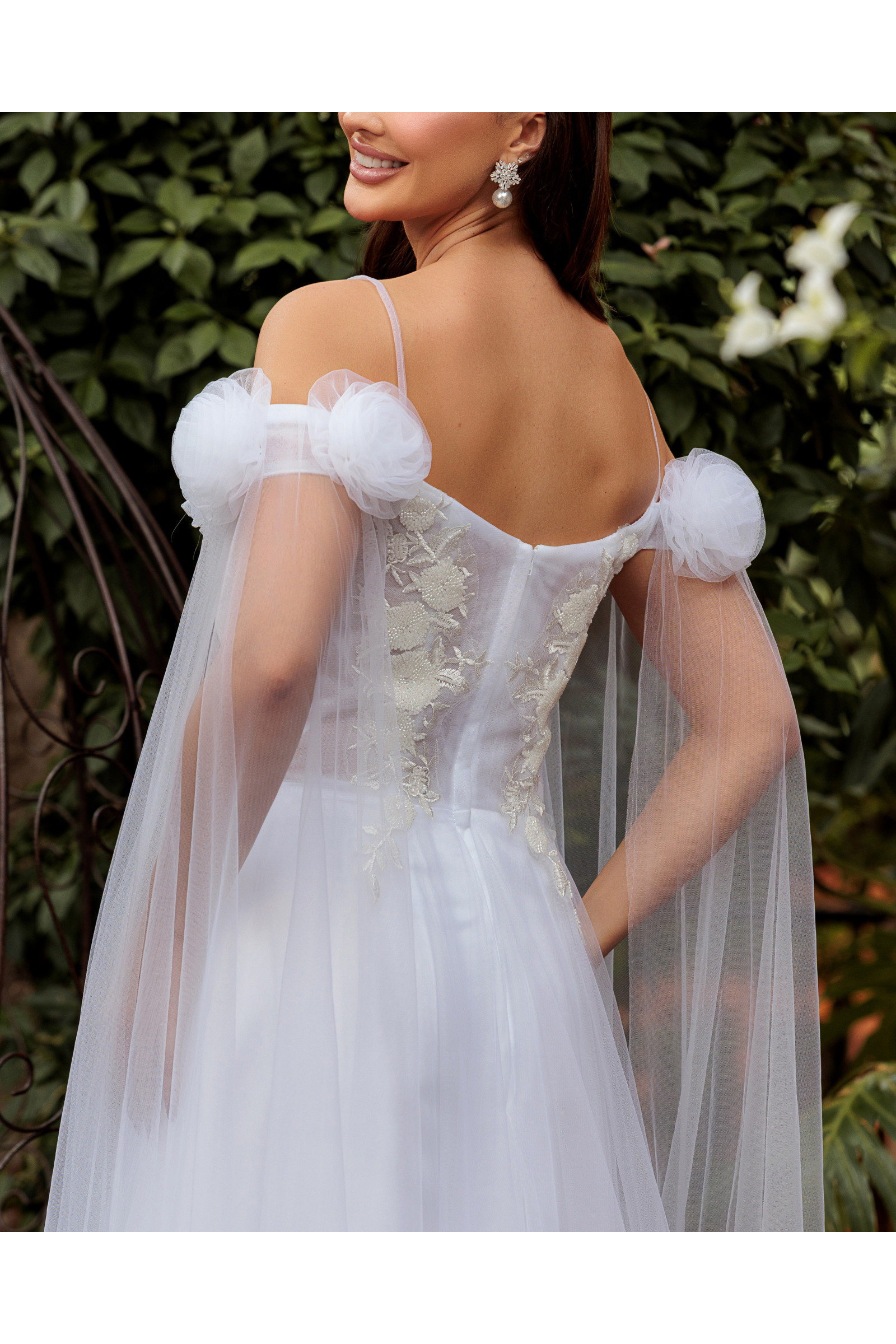 Flor de Tule no Ombro: Um detalhe artesanal que traz delicadeza e exclusividade ao design.