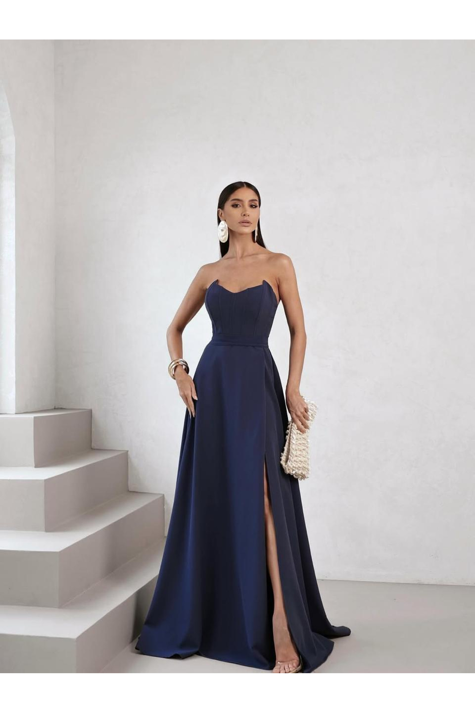 O diferencial deste modelo reside no busto com barbatanas expostas, uma tendência inspirada no estilo corset que proporciona sustentação extra e define o tronco com precisão. O decote tomara que caia com bojo valoriza o colo, enquanto a saia longa com fenda lateral adiciona leveza e movimento ao visual estruturado.
