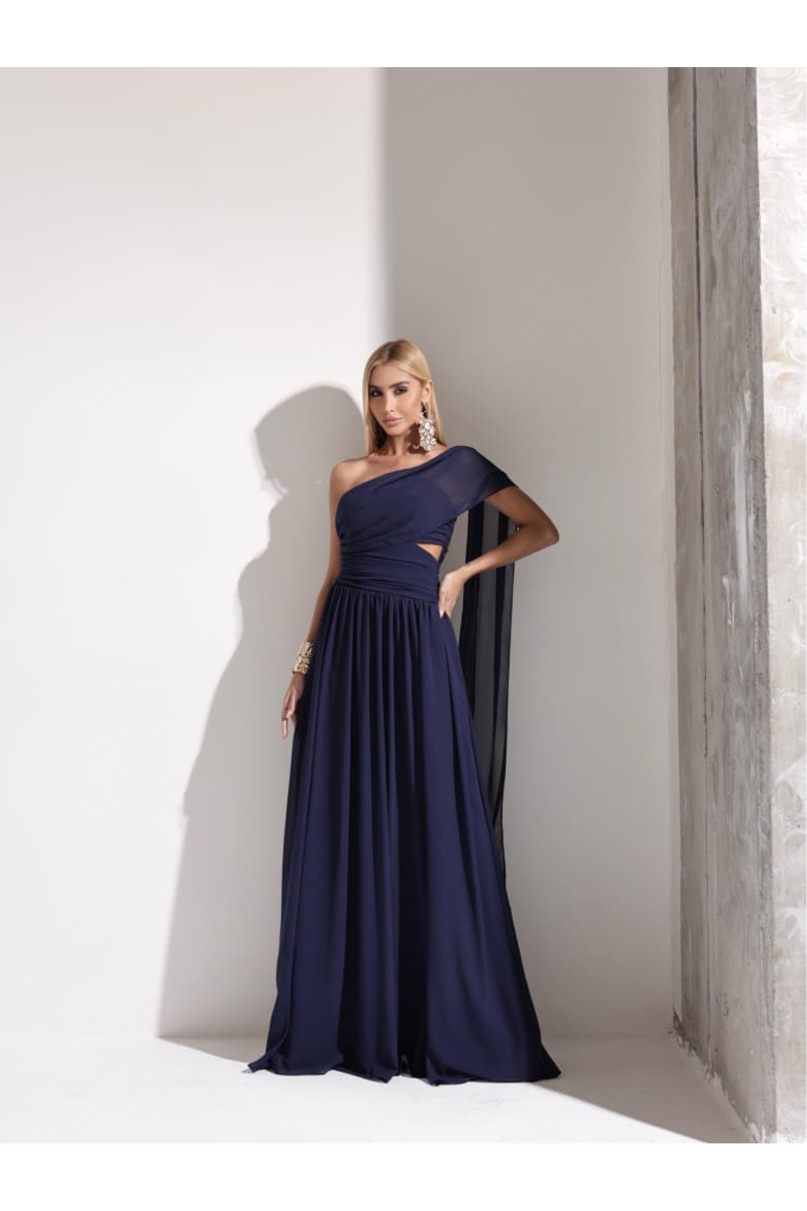 O grande diferencial deste modelo é a capa fixa em um dos ombros, que cria um efeito dramático e luxuoso a cada passo, complementada por delicadas alças finas que garantem leveza ao colo. O busto apresenta um trabalho drapeado minucioso, que valoriza a silhueta, enquanto uma leve abertura na cintura (cut-out) adiciona um toque de sensualidade contemporânea e refinada.
