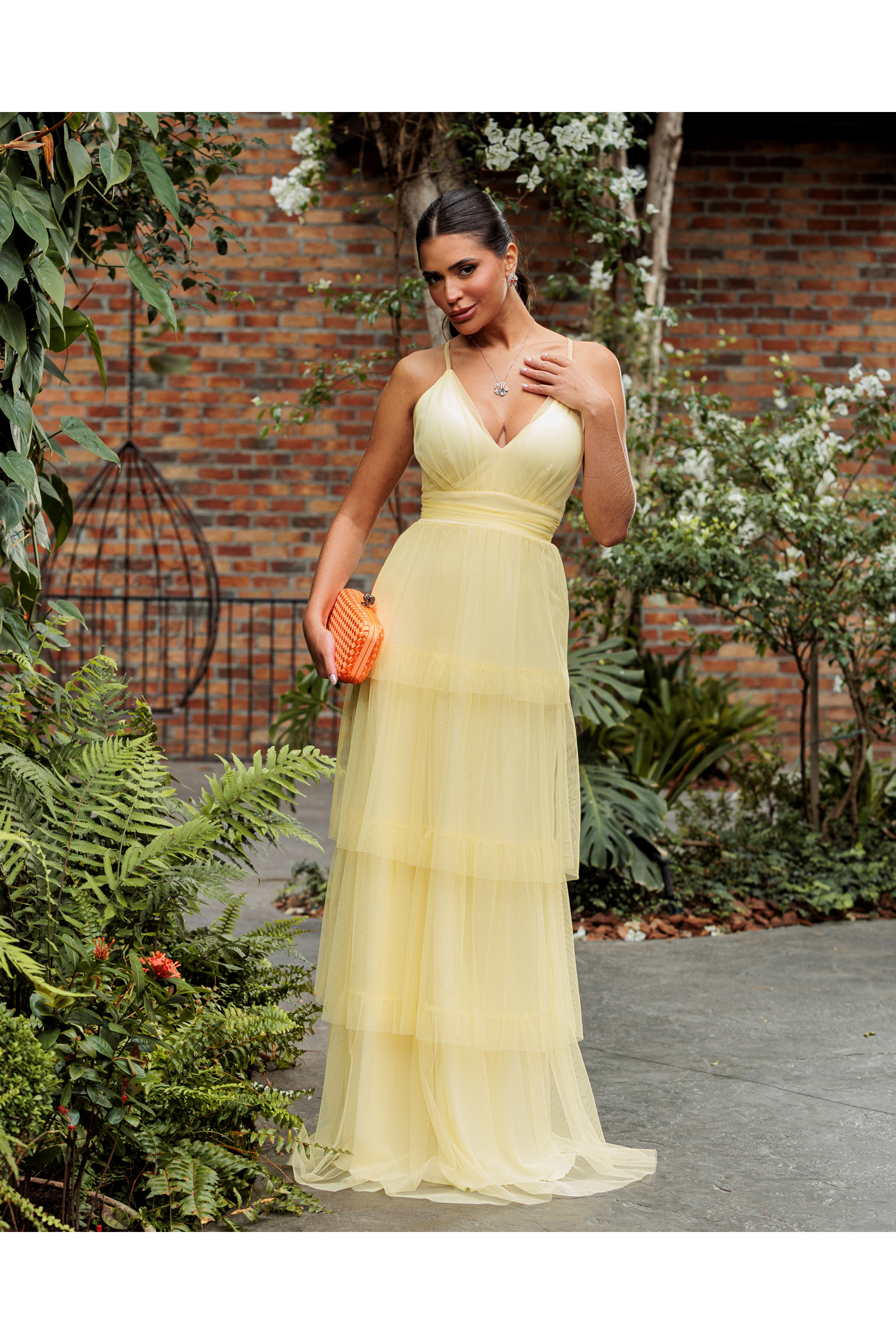 O design apresenta um decote em V estruturado com bojo interno, garantindo sustentação e um colo impecável. O grande protagonista, porém, está no detalhe das costas: um recorte aberto com alças finas cruzadas que trazem uma sensualidade delicada e moderna. A saia em camadas adiciona volume estratégico e uma fluidez encantadora ao caminhar, transformando cada passo em um momento inesquecível.