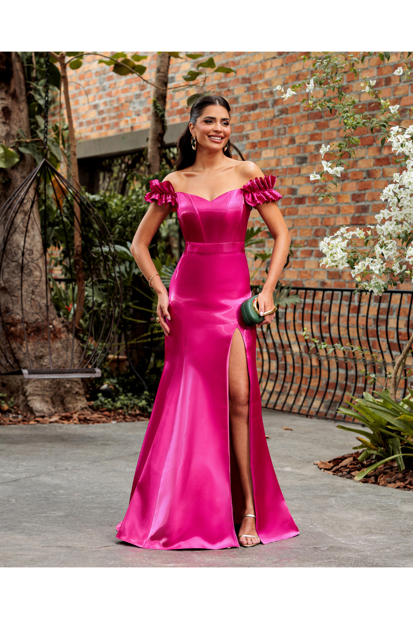 Sua modelagem apresenta o clássico decote ombro a ombro, enriquecido com o detalhe de flores artesanais nos ombros, que conferem um ar de alta costura e romantismo moderno à peça. O corte da saia em estilo sereia esculpe a silhueta com precisão, enquanto a fenda frontal adiciona um toque de sensualidade refinada e facilita o movimento, garantindo uma entrada triunfal.