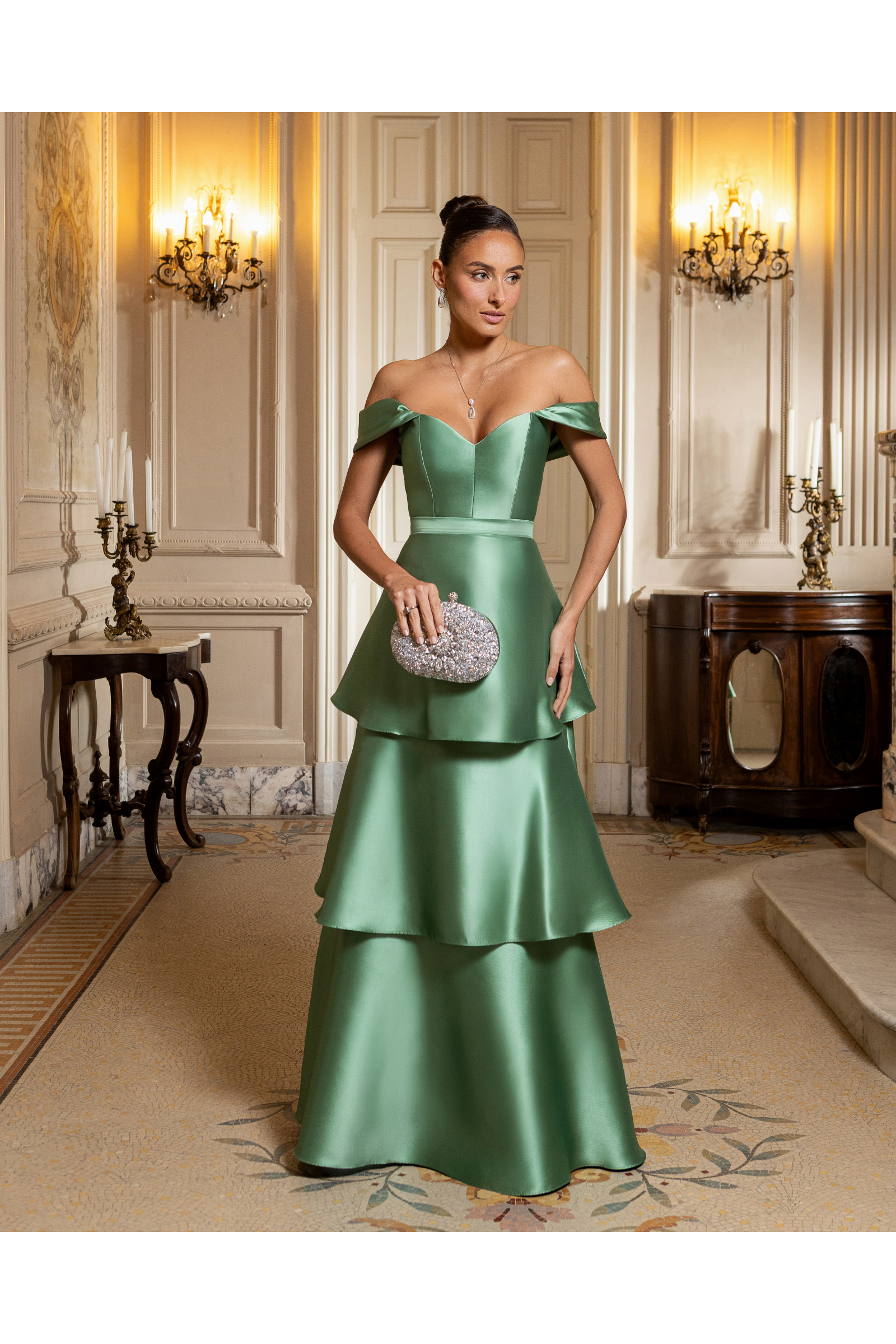 O design apresenta um elegante decote ombro a ombro, que valoriza o colo e os braços com delicadeza, acompanhado de busto com bojo para máxima sustentação. O grande diferencial está na saia em camadas, que confere volume e movimento à peça, criando um visual luxuoso e imponente para madrinhas, formandas e convidadas de eventos black-tie.
