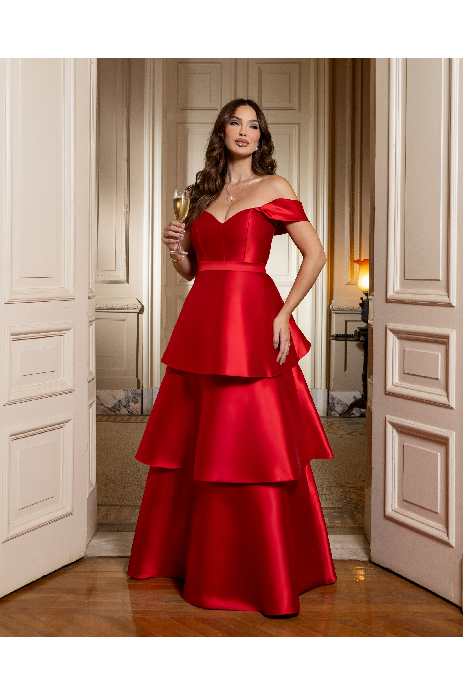 O design apresenta um elegante decote ombro a ombro, que valoriza o colo e os braços com delicadeza, acompanhado de busto com bojo para máxima sustentação. O grande diferencial está na saia em camadas, que confere volume e movimento à peça, criando um visual luxuoso e imponente para madrinhas, formandas e convidadas de eventos black-tie.