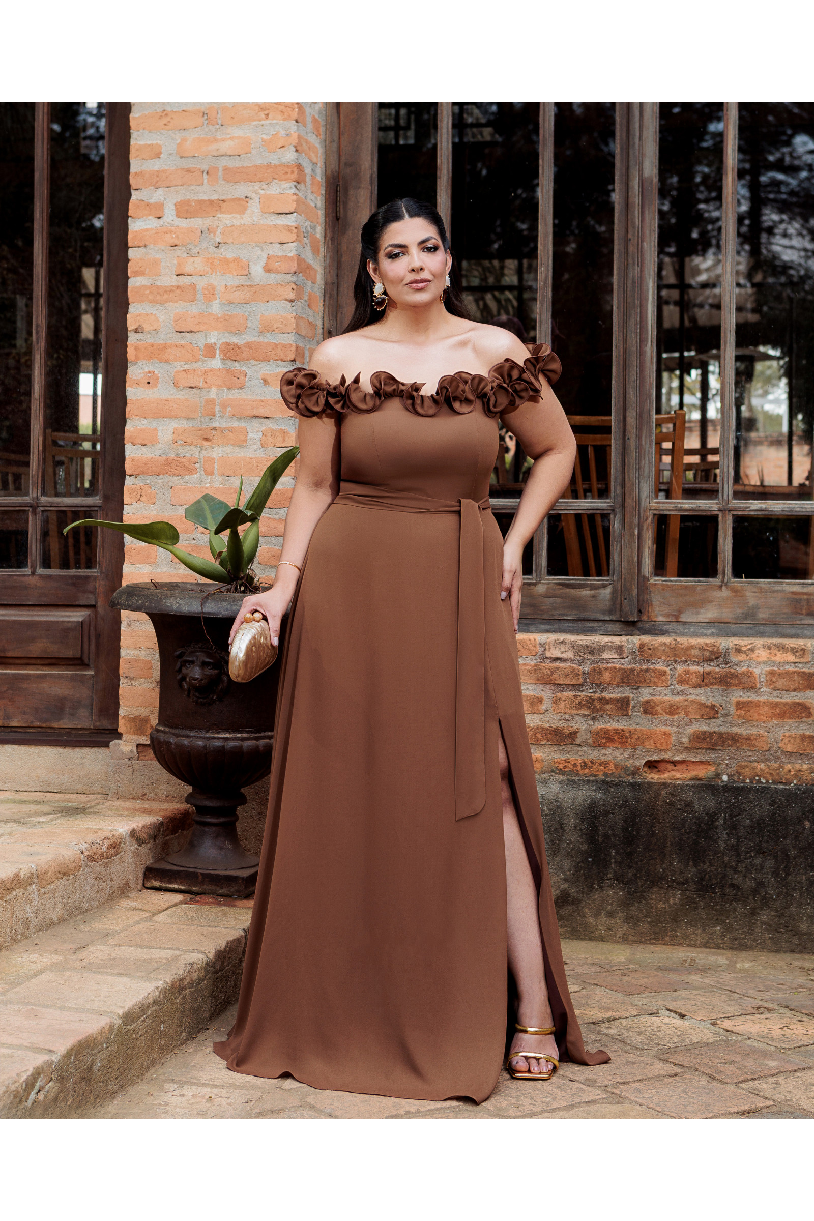 VESTIDO DE FESTA PÂMELA PLUS SIZE DETALHE FLOR - MARROM