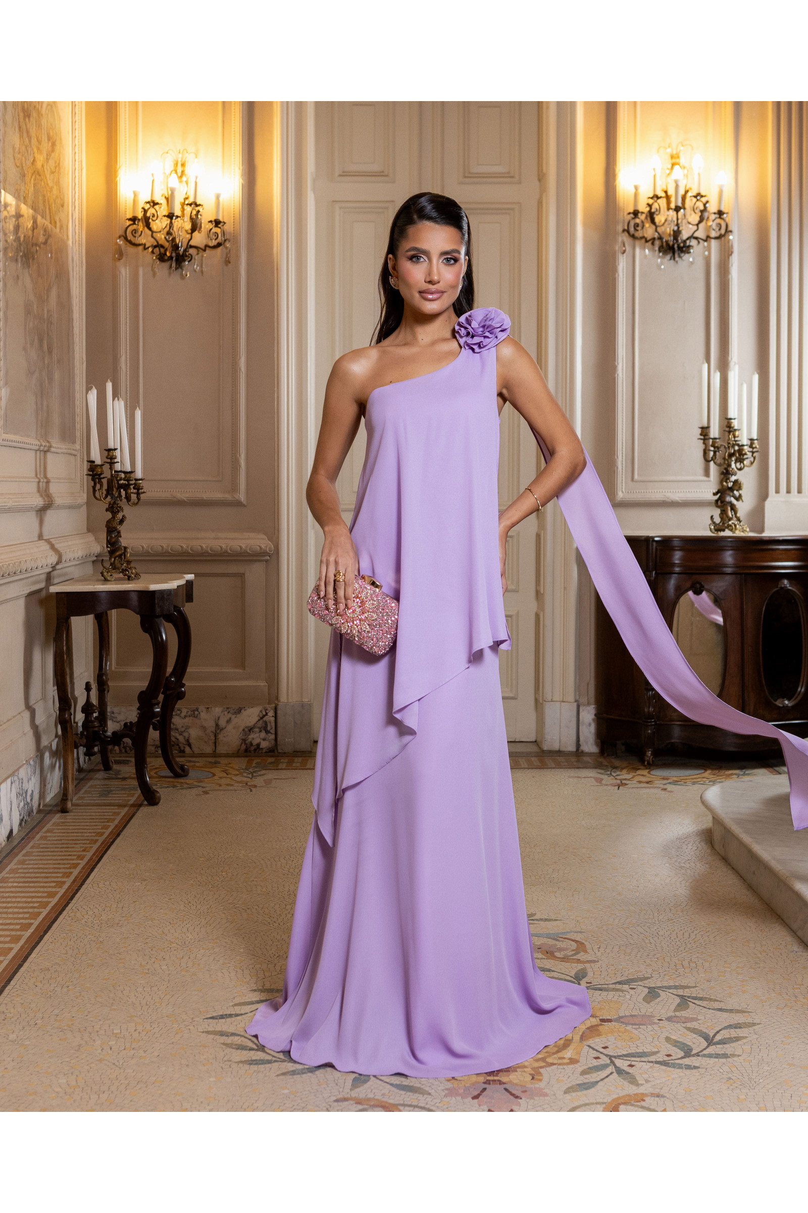 O grande diferencial desta peça é a cauda no ombro com aplicação de flor fixa, um detalhe escultural que transforma o look em uma obra de arte. A saia, elaborada com camadas de babados sutis, garante movimento etéreo a cada passo, tornando-o a escolha perfeita para madrinhas, formandas e convidadas de casamentos luxuosos.
