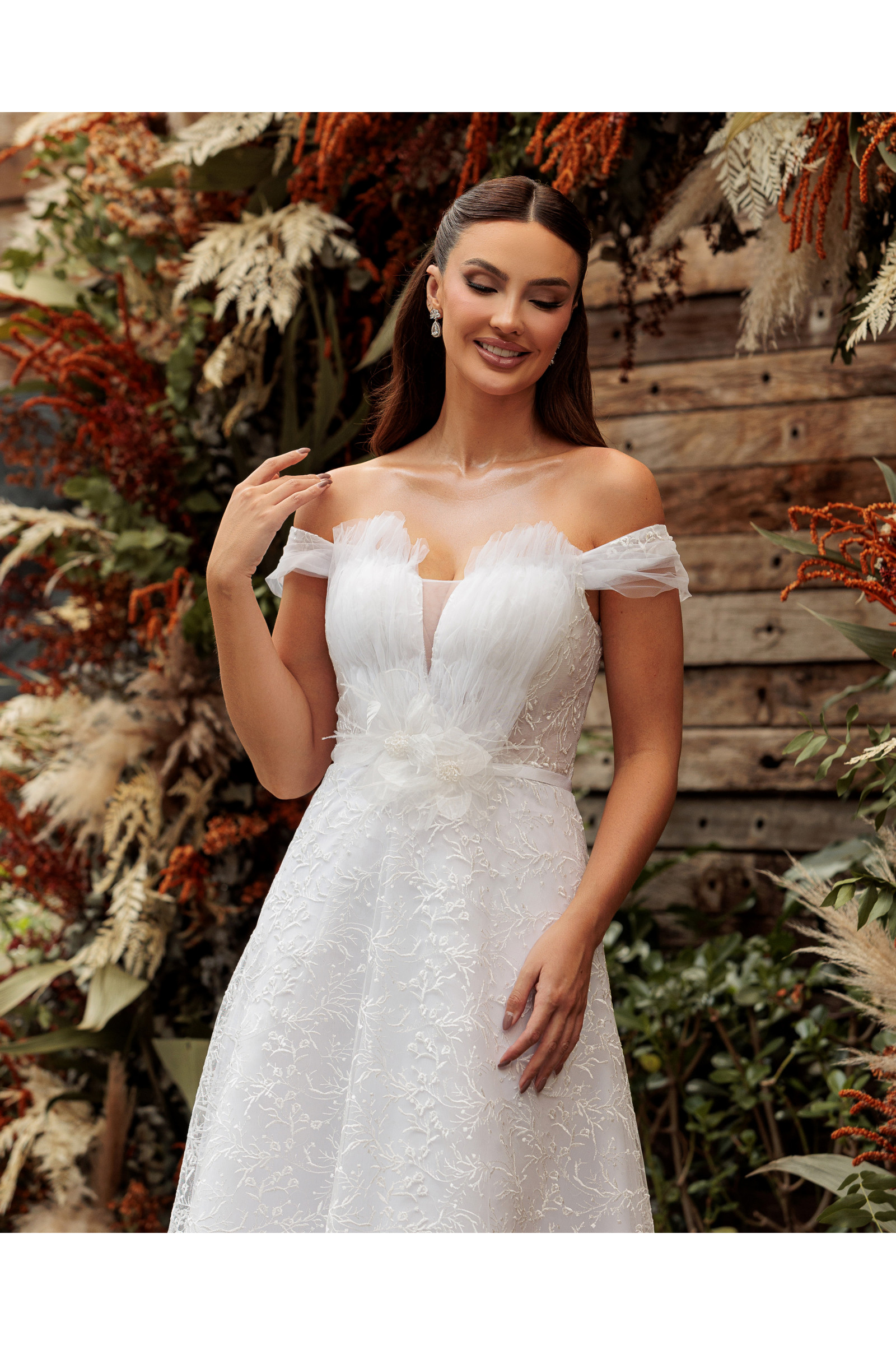 O design destaca-se pelo decote ombro a ombro, que emoldura o rosto e o colo com uma aura romântica. O ponto alto da peça é a aplicação de bordados delicados em tons de Off-White/Branco, que ganham relevo com uma flor escultural no busto, criando um ponto focal de alta costura que exala exclusividade. O forro em Acetato Nobre garante que a saia flutue com um movimento celestial, mantendo o toque acetinado e o conforto térmico indispensáveis para o grande dia.