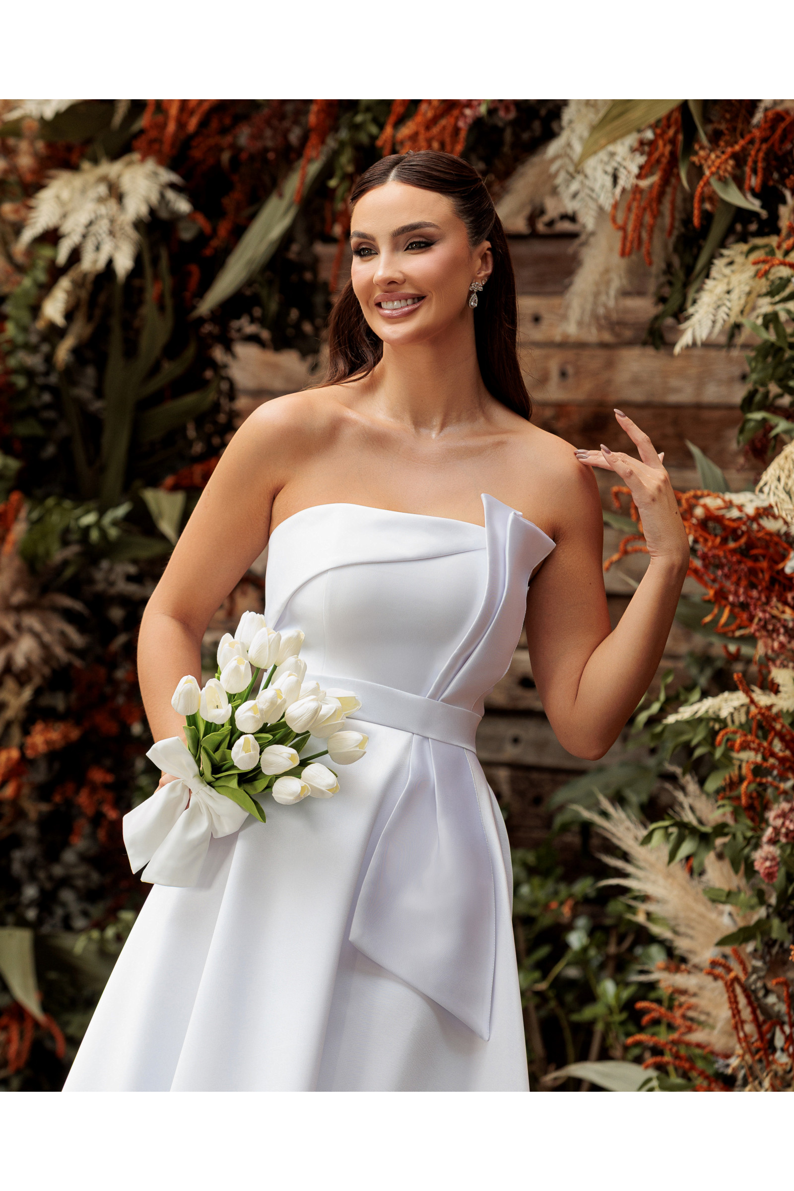 Com modelagem Tomara que Caia (T.Q.C.), o destaque desta peça reside no detalhe em pala frontal, que emoldura o busto com um drapeado arquitetônico e moderno. O comprimento midi traz o equilíbrio perfeito entre o clássico e o contemporâneo, tornando-o a escolha ideal para noivas em casamentos civis, mini weddings, ensaios pre-wedding ou celebrações de batizado e noivado.