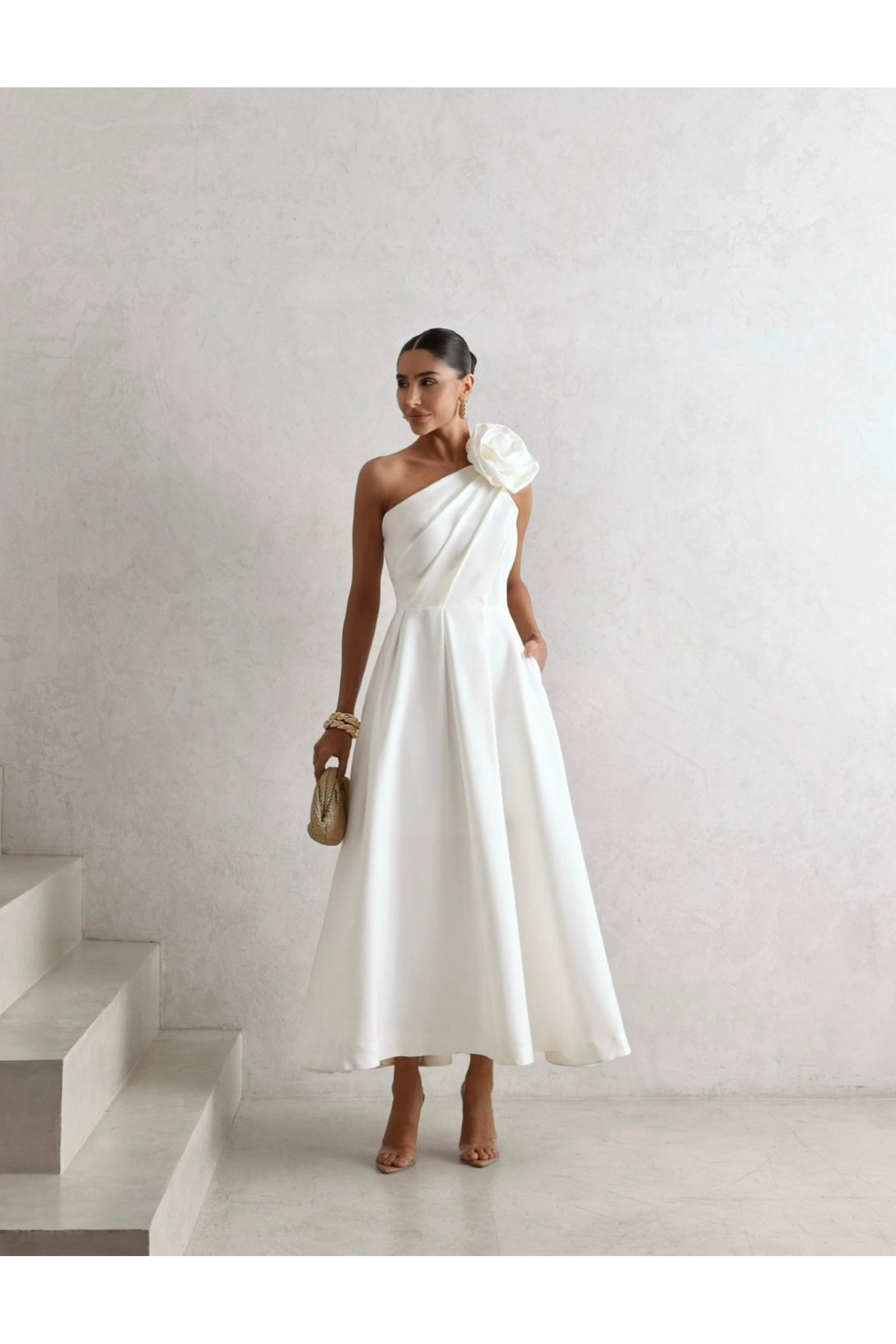 O grande destaque desta peça é a maxi flor aplicada no ombro, um detalhe imponente e super feminino que transforma o vestido em um item de design exclusivo. Com modelagem um ombro só (nula manga) e comprimento midi, este vestido equilibra elegância e presença com charme absoluto, garantindo que você seja o centro das atenções com delicadeza e personalidade.