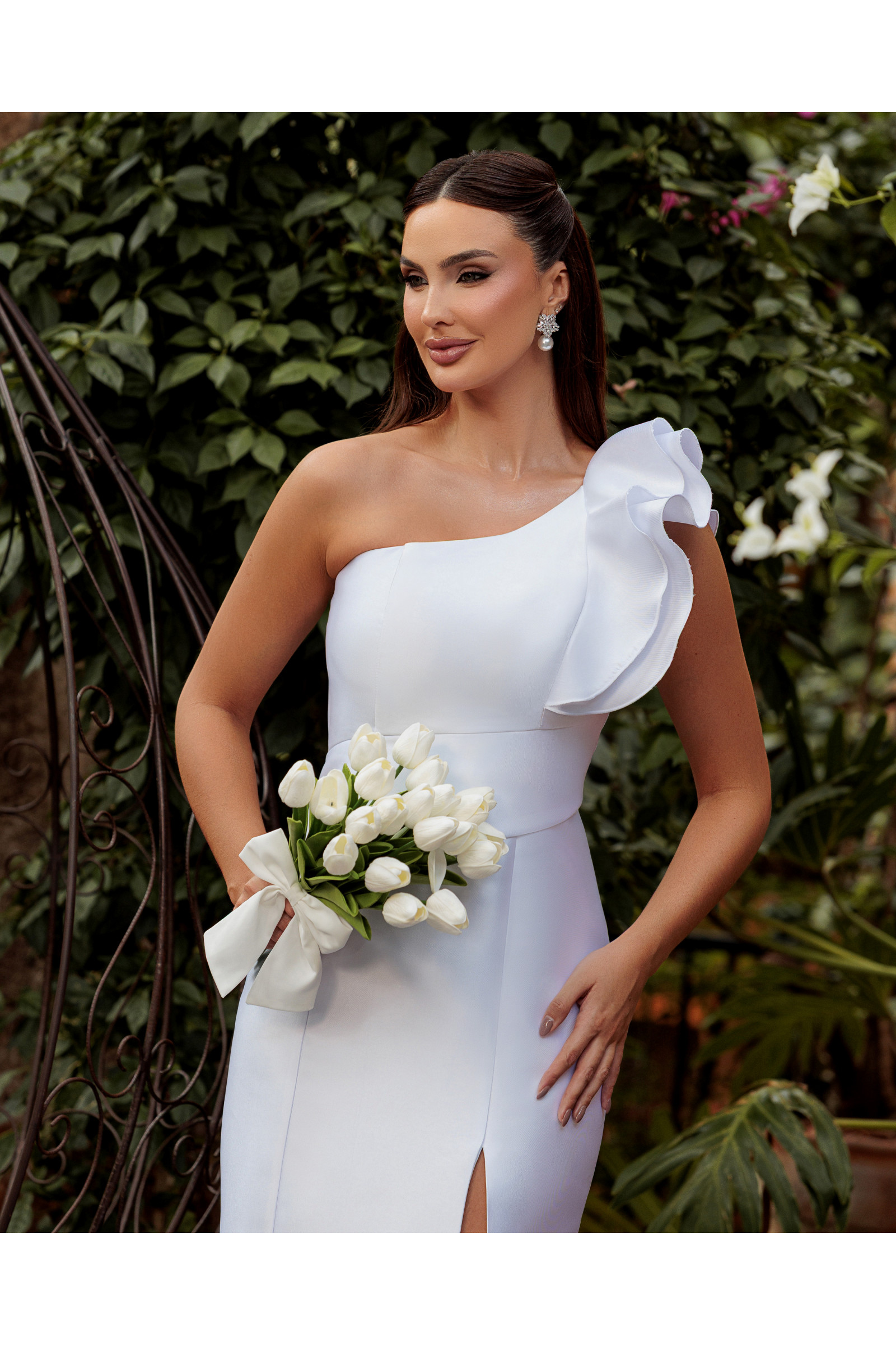 O design de um ombro só confere uma assimetria moderna e sofisticada, coroada por um laço estruturado no ombro que traz um ar de alta costura à peça. Para equilibrar a sobriedade do tecido encorpado, o vestido apresenta uma fenda frontal estratégica, que adiciona movimento e um toque de sensualidade refinada. Com bojo embutido e inteiramente forrado, o Vestido Patricia garante sustentação e um caimento que valoriza a silhueta com perfeição.