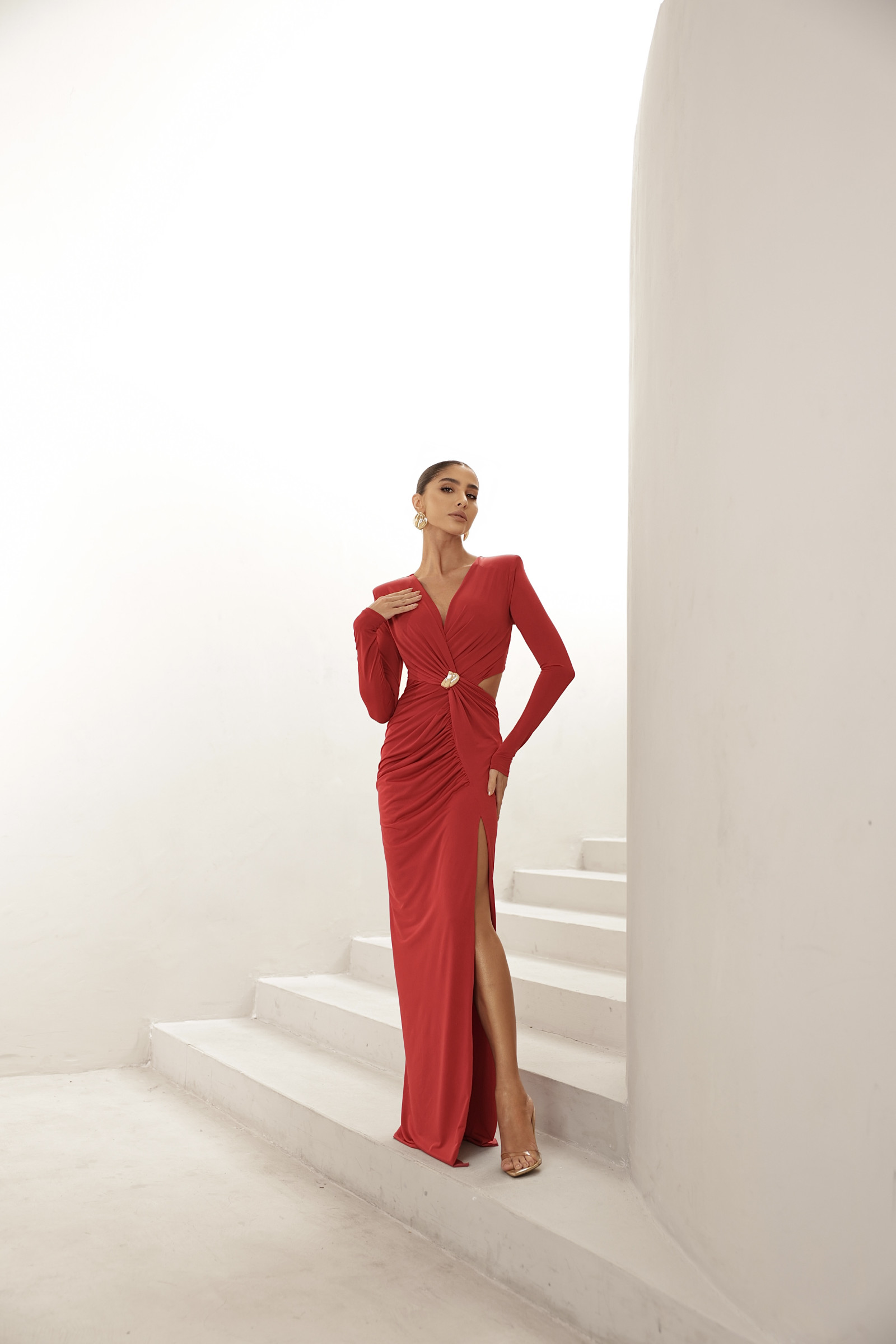 Visual Imponente: Como o vestido possui ombreiras e manga longa, penteados presos ajudam a destacar a estrutura superior da peça.