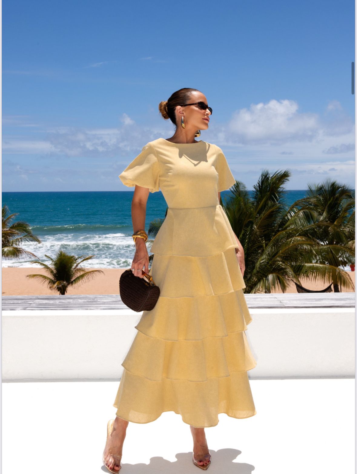 Com modelagem midi em camadas, ele traz movimento e fluidez ao look, garantindo presença em qualquer ocasião. As mangas bufantes, super tendência, adicionam um toque romântico e sofisticado, enquanto o tecido em viscolinho oferece conforto, leveza e caimento impecável.