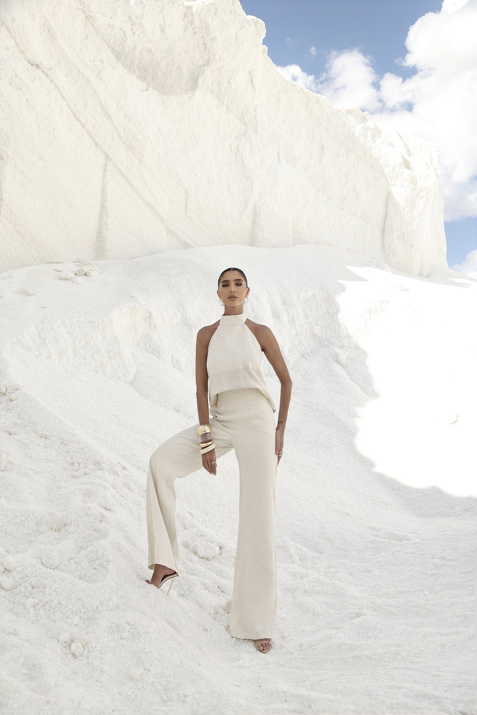 A blusa frente única com gola alta estilo halter valoriza o pescoço e os ombros, proporcionando um visual moderno e feminino. O lastex posterior garante ajuste perfeito e conforto durante todo o uso. Já a calça de alfaiataria reta e cintura alta alonga a silhueta e confere um caimento impecável, ideal para diversas ocasiões — de um almoço elegante a um evento noturno. 🌿