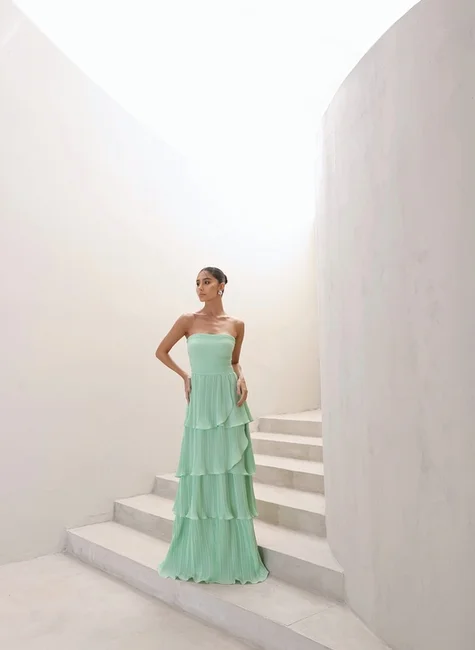Um verdadeiro clássico dos vestidos de festa 💃✨ O Espanha Longo une a delicadeza do tomara que caia com a sofisticação das camadas plissadas, criando um visual romântico e impactante em qualquer ocasião.